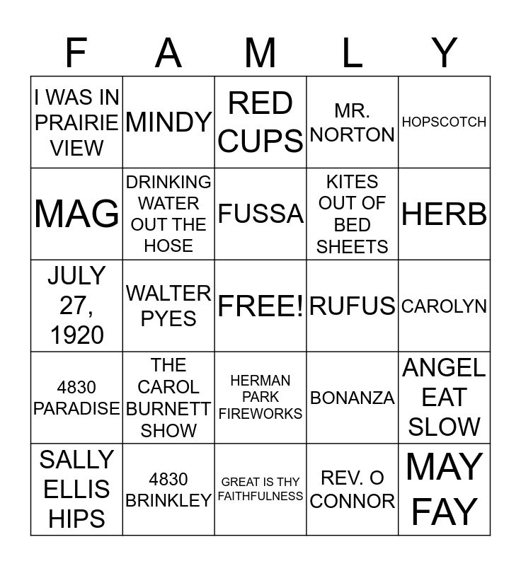 This bingo card has a free space and 96 words: BEVERLY ANN, CLAIROL BLACK HAIR DYE, CHARLES MAGNOLIA, RUFUS, 49 YEARS OF MARRIAGE, WORLD WAR II ARMY, GO GET ME A SWITCH, ROAD TRIP SNACKS, LEMON MERINGUE PIE, POSTMAN 33 YEARS, DRILL SERGEANT VAN, COLD WELL WATER, HELEN-ETTE, HERB, DUDE, MAG, FUSSA, PIERRE, RED HAIR DYE, THE NEIGHBOR WHO DOESN'T KNOCK, PARIS, 5 BURGERS FOR A $1, KITIRIK ON CHANNEL 13, HELEN, HERMAN PARK FIREWORKS, GREAT IS THY FAITHFULNESS, LOVE OF LIFE, I WAS IN PRAIRIE VIEW, POOR CHICKEN HAS TO DIE..., GIVE ME THE KEY ( NECY), THE YOUNG AND THE RESTLESS, BONANZA, PLAYING SQUARE INTHE STREET, FIG PRESERVES, HOPSCOTCH, CALLING WINDOW SEATS, ANGEL EAT SLOW, VINCENT THE COMEDIAN, LAST PEOPLE TO LEAVE CHURCH, WALTER PYES, SUNNYSIDE, SALLY ELLIS HIPS, MAY FAY, 4830 BRINKLEY, 4830 PARADISE, RED CUPS, BABY BOOMERS SHOT, CROCKETT, TX, DEACON, CHINESE CHECKERS, BB GUNS, ALL DAY SUCKERS WITH COIN, WHEN YOU MOVE YOU LOSE, SHOOTING MARBLES, MONOPOLY, DEACONESS, SAY YES MAAM 2 GRANDMOTHER, FED MART GROCERIES, MITCH MILLER CHRISTMAS, FOOTBALL ON THE CORNER, VALENCIA, VINESSA, COURTNEY, I'M 2 INCHES OFF YOUR BACK, DON'T I OWE YOU A WHIPPING, WHOLE RACCOON IN POT, HO CAKES, PTA, WHITE MISSIONARY DRESS, REV. O CONNOR, NORTHSIDE ANTIOCH CHURCH, CRABBING, LINCOLN DRIVE-IN, CALLING HOME AHEAD, THE LIFE OF RILEY, LEAVE IT TO BEAVER, CHEMISTRY SETS, DRINKING WATER OUT THE HOSE, CHINA BERRY TREE FIGHTS, KITES OUT OF BED SHEETS, MR. NORTON, 10 MOON COOKIES FOR 5 CENTS, CANDY NECKLACES, HULA HOOPS, SEPTEMBER 28, 1916, JULY 27, 1920, THE CAROL BURNETT SHOW, WEINGARTEN'S, CYNTHIA, CAROLYN, BETTY, LAWRENCE, ROBERT, TONI, MINDY and DALE.