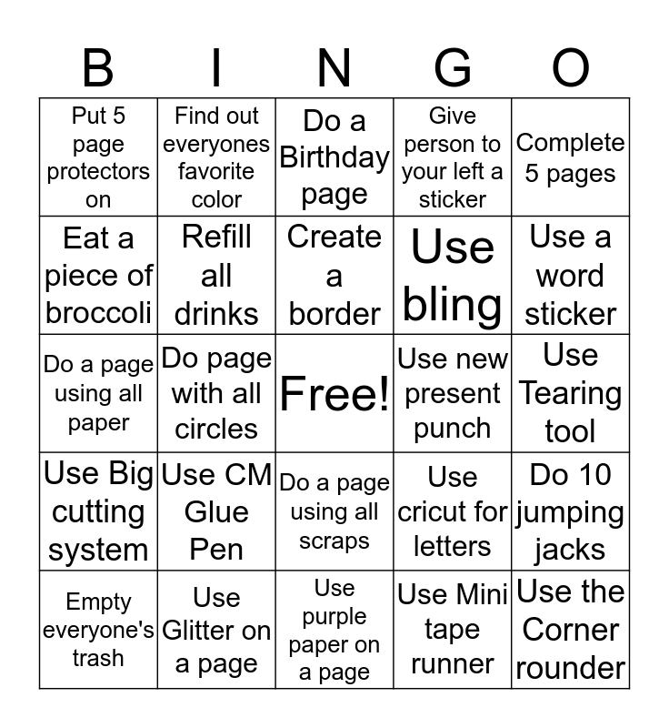 This bingo card has a free space and 24 words: Use CM Glue Pen, Use Glitter on a page, Create a border, Empty everyone's trash, Complete 5 pages, Put 5 page protectors on, Eat a piece of broccoli, Find out everyones favorite color, Use new present punch, Do a page using all scraps, Use bling, Do a page using all paper, Use cricut for letters, Do 10 jumping jacks, Refill all drinks, Use Mini tape runner, Use Tearing tool, Do a Birthday page, Use a word sticker, Do page with all circles, Use the Corner rounder, Use Big cutting system, Give person to your left a sticker and Use purple paper on a page.