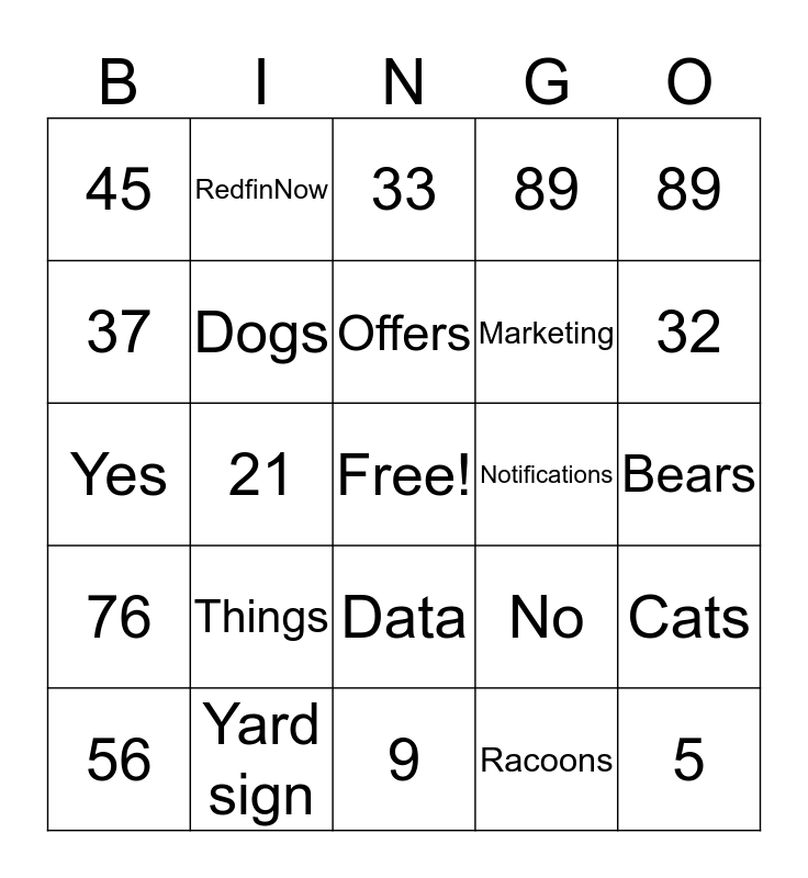 This bingo card has a free space and 24 words: Things, Yard sign, Offers, 56, 89, 45, 37, RedfinNow, Notifications, Data, Marketing, Yes, No, Cats, Dogs, Racoons, Bears, 33, 32, 21, 5, 76, 89 and 9.