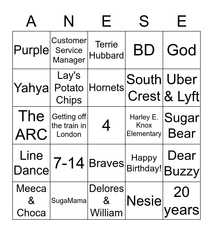 This bingo card has 25 words: 7-14, Delores & William, Hornets, Meeca & Choca, God, Purple, Yahya, Customer Service Manager, Harley E. Knox Elementary, Braves, South Crest, The ARC, Happy Birthday!, Dear Buzzy, Lay's Potato Chips, 20 years, Sugar Bear, Terrie Hubbard, Uber & Lyft, Getting off the train in London, 4, SugaMama, Line Dance, BD and Nesie.