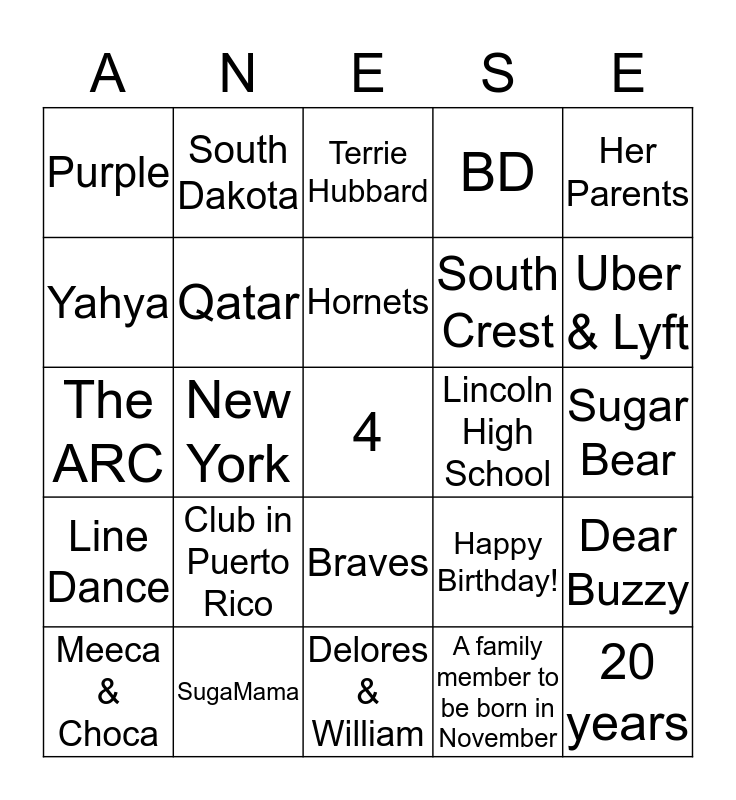 This bingo card has 25 words: Club in Puerto Rico, Delores & William, Hornets, Meeca & Choca, Her Parents, Purple, Yahya, South Dakota, Lincoln High School, Braves, South Crest, The ARC, Happy Birthday!, Dear Buzzy, Qatar, 20 years, Sugar Bear, Terrie Hubbard, Uber & Lyft, New York, 4, SugaMama, Line Dance, BD and A family member to be born in November.