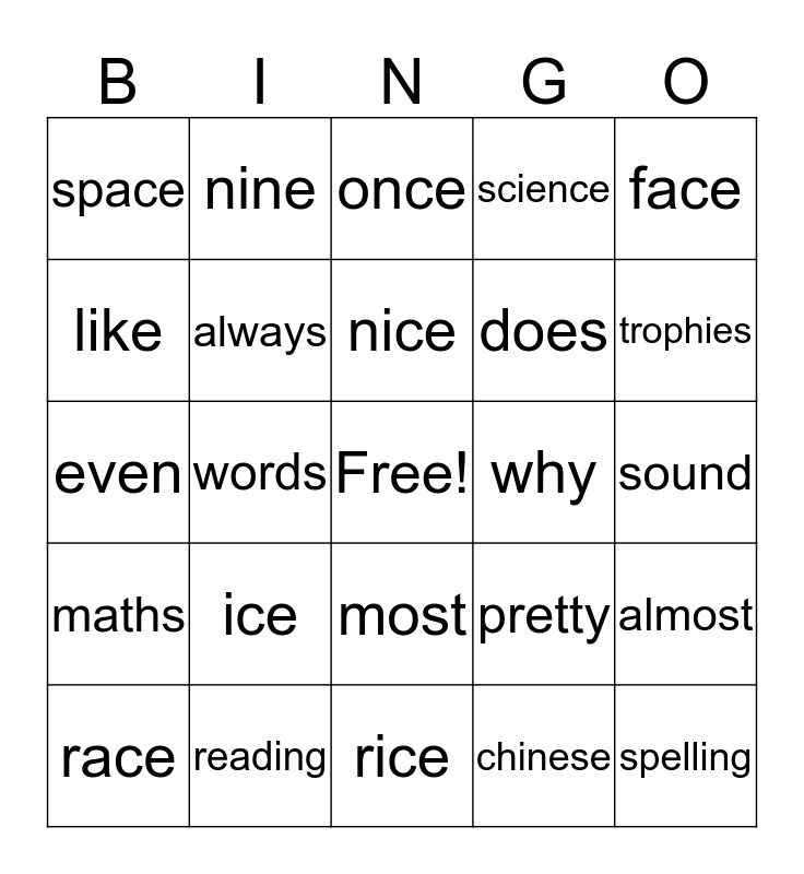 This bingo card has a free space and 25 words: ice, rice, nice, race, face, space, like, nine, why, most, does, even, pretty, almost, always, say, sound, once, trophies, words, spelling, reading, maths, science and chinese.