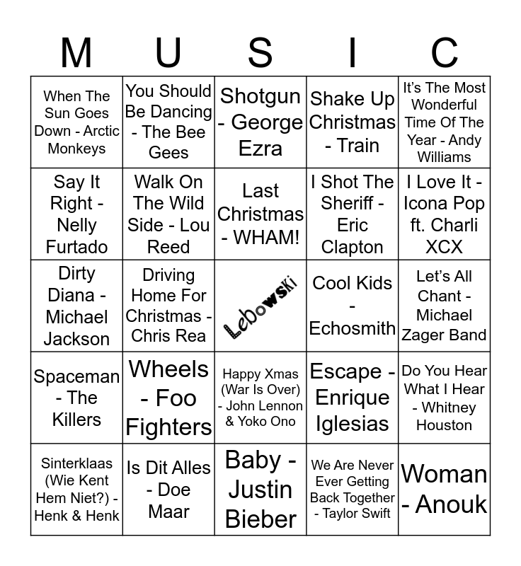 This bingo card has a free space and 24 words: Wheels - Foo Fighters, Is Dit Alles - Doe Maar, Last Christmas - WHAM!, Sinterklaas (Wie Kent Hem Niet?) - Henk & Henk, It’s The Most Wonderful Time Of The Year - Andy Williams, When The Sun Goes Down - Arctic Monkeys, Say It Right - Nelly Furtado, You Should Be Dancing - The Bee Gees, Cool Kids - Echosmith, Happy Xmas (War Is Over) - John Lennon & Yoko Ono, I Shot The Sheriff - Eric Clapton, Dirty Diana - Michael Jackson, Escape - Enrique Iglesias, Do You Hear What I Hear - Whitney Houston, Walk On The Wild Side - Lou Reed, We Are Never Ever Getting Back Together - Taylor Swift, Let’s All Chant - Michael Zager Band, Shotgun - George Ezra, I Love It - Icona Pop ft. Charli XCX, Driving Home For Christmas - Chris Rea, Woman - Anouk, Spaceman - The Killers, Shake Up Christmas - Train and Baby - Justin Bieber.