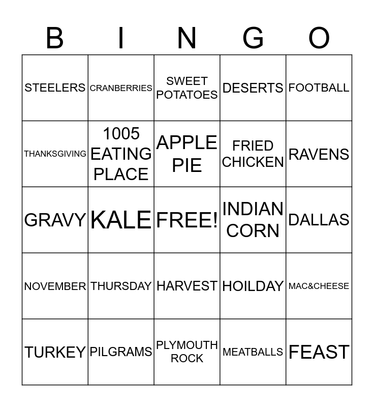 This bingo card has a free space and 24 words: THURSDAY, PILGRAMS, APPLE PIE, TURKEY, FOOTBALL, STEELERS, THANKSGIVING, CRANBERRIES, INDIAN CORN, HARVEST, FRIED CHICKEN, GRAVY, HOILDAY, MAC&CHEESE, 1005 EATING PLACE, MEATBALLS, DALLAS, SWEET POTATOES, RAVENS, KALE, FEAST, NOVEMBER, DESERTS and PLYMOUTH ROCK.