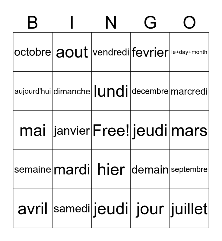 This bingo card has a free space and 24 words: avril, mardi, lundi, jour, le+day+month, octobre, aout, vendredi, jeudi, mars, mai, dimanche, demain, septembre, aujourd'hui, samedi, jeudi, fevrier, marcredi, semaine, janvier, hier, decembre and juillet.