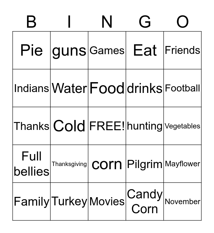This bingo card has a free space and 24 words: Thanksgiving, Turkey, Food, Family, Friends, Pie, Indians, guns, hunting, corn, drinks, Thanks, Pilgrim, Mayflower, Water, Candy Corn, Vegetables, Games, Football, Cold, November, Full bellies, Eat and Movies.