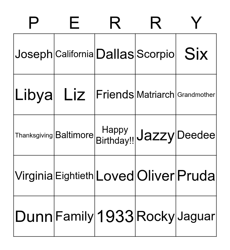 This bingo card has a free space and 24 words: Eightieth, Family, Friends, Dunn, Six, Joseph, Libya, California, Jazzy, Loved, Matriarch, Thanksgiving, Oliver, Pruda, Liz, Rocky, Deedee, Dallas, Grandmother, Baltimore, Jaguar, Virginia, Scorpio and 1933.