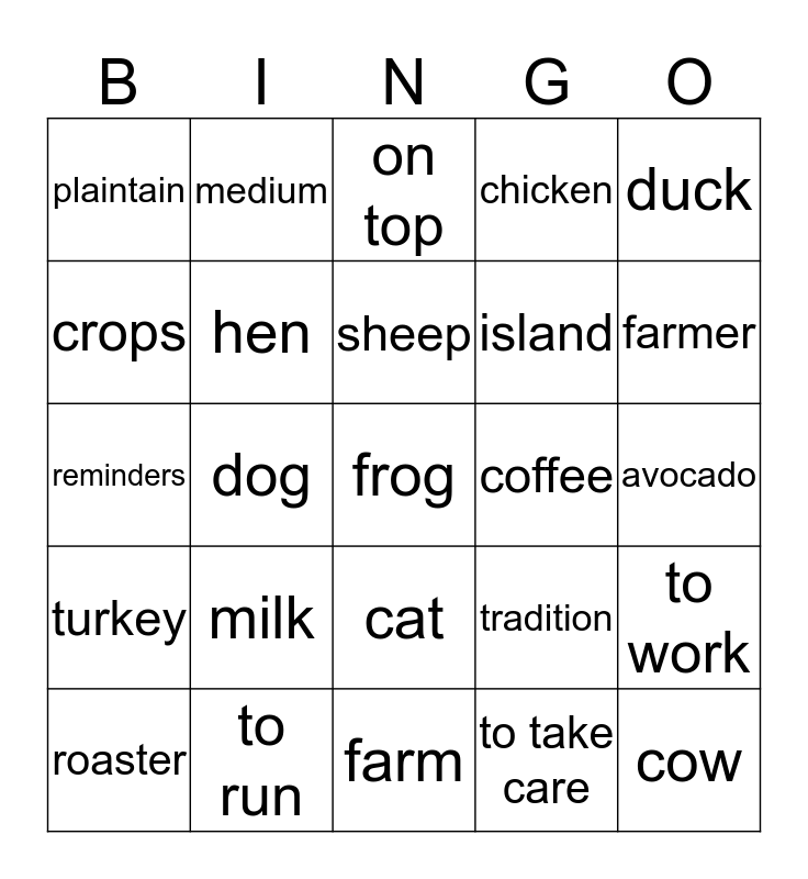 This bingo card has a free space and 39 words: Donkey, horse, pig, hen, roaster, cat, sheep, bird, duck, turkey, dog, chicken, cow, avocado, coffee, milk, pineapple, plaintain, tail, tradition, crops, farm, island, farmer, mud, mascot, grass, Puertorican, affective, medium, hairy, behind, on top, to run, to take care, to sleep, to work, reminders and to come.