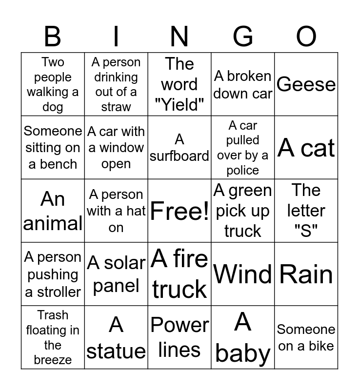 This bingo card has a free space and 24 words: A solar panel, A statue, A surfboard, Trash floating in the breeze, Geese, Two people walking a dog, Someone sitting on a bench, A person drinking out of a straw, A green pick up truck, A fire truck, A car pulled over by a police, An animal, Wind, Rain, A car with a window open, A baby, The letter "S", The word "Yield", A cat, A person with a hat on, Someone on a bike, A person pushing a stroller, A broken down car and Power lines.