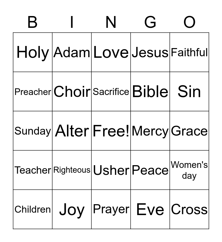 This bingo card has a free space and 34 words: God, Blessings, Suffering, Church, Grace, Preacher, Choir, Prayer, Bible, Cross, Sunday, Adam, Eve, Decon, Teacher, Alter, Usher, Mercy, Women's day, Children, Joy, Christ, Jesus, Sin, Savior, Righteous, Love, Angel, Faithful, Holy, Master, Sacrifice, Peace and Giving.