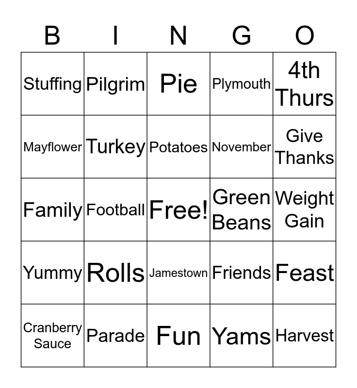 This bingo card has a free space and 29 words: Corn, Parade, Pie, Leftovers, 4th Thurs, Stuffing, Turkey, Potatoes, Green Beans, Feast, Cranberry Sauce, Football, Yams, Harvest, Family, Pumpkin, Fun, Friends, Give Thanks, Yummy, Rolls, Traditions, November, Weight Gain, Mayflower, Pilgrim, Jamestown, Plymouth and Fall.