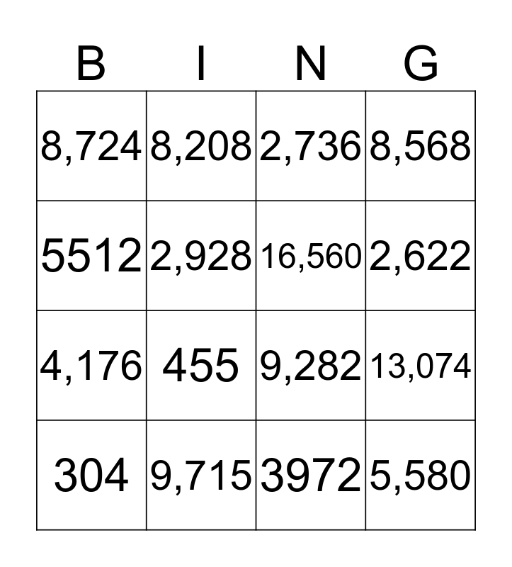 This bingo card has 18 words: 455, 5,580, 2,736, 8,724, 9,282, 8,568, 304, 8,208, 2,622, 4,176, 3972, 5512, 13,074, 2,928, 16,560, 216, 9,715 and 3,145.