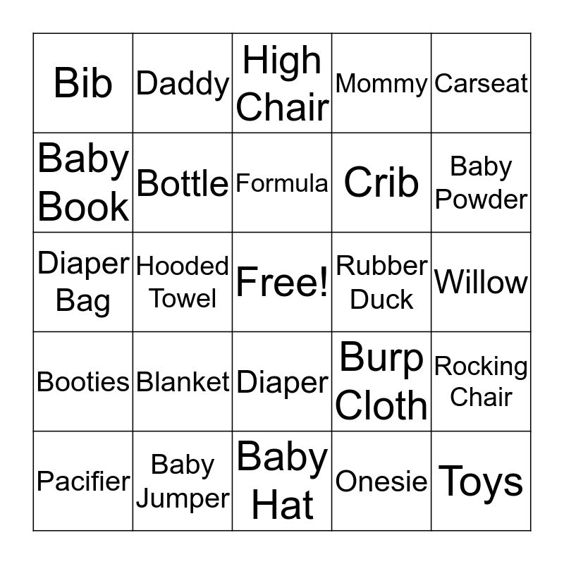This bingo card has a free space and 29 words: Pacifier, Baby Food, Hooded Towel, Teether, Bib, High Chair, Bottle, Blanket, Rubber Duck, Baby Jumper, Willow, Toys, Baby Hat, Onesie, Baby Powder, Rattle, Diaper, Booties, Carseat, Diaper Bag, Burp Cloth, Baby Socks, Crib, Baby Book, Mommy, Daddy, Rocking Chair, Formula and Stuffed Animal.