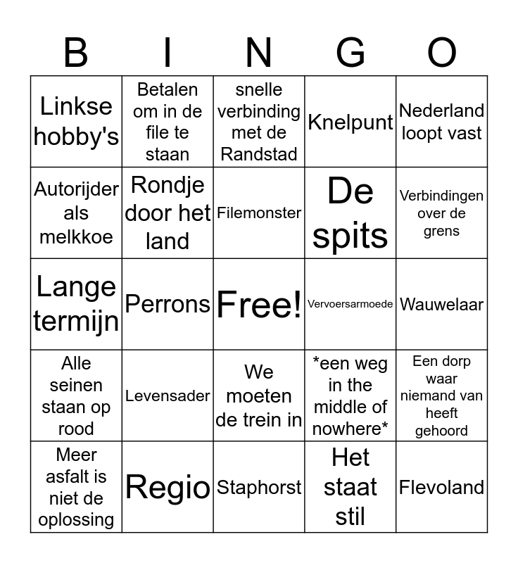 This bingo card has a free space and 24 words: Levensader, Regio, Filemonster, Meer asfalt is niet de oplossing, Nederland loopt vast, Linkse hobby's, Autorijder als melkkoe, Betalen om in de file te staan, Vervoersarmoede, We moeten de trein in, De spits, Lange termijn, *een weg in the middle of nowhere*, Een dorp waar niemand van heeft gehoord, Rondje door het land, Het staat stil, Wauwelaar, snelle verbinding met de Randstad, Verbindingen over de grens, Perrons, Flevoland, Alle seinen staan op rood, Knelpunt and Staphorst.