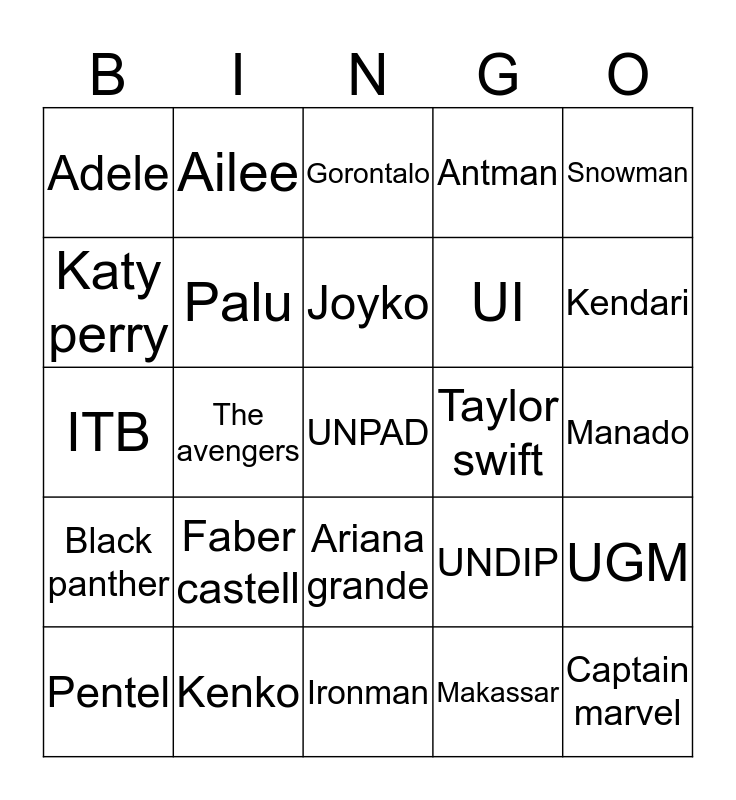 This bingo card has a free space and 24 words: Faber castell, Kenko, Joyko, Pentel, Snowman, Adele, Katy perry, Ailee, Taylor swift, Ariana grande, UI, ITB, UNDIP, UGM, Palu, Makassar, Manado, Gorontalo, Kendari, The avengers, Captain marvel, Black panther, Antman and Ironman.
