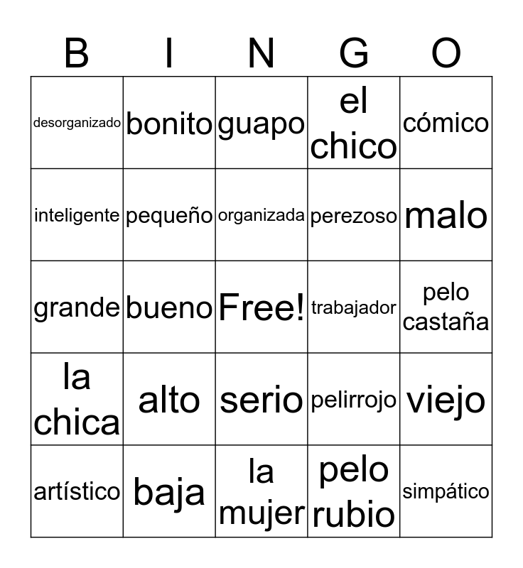 This bingo card has a free space and 24 words: alto, baja, organizada, artístico, cómico, desorganizado, inteligente, bonito, trabajador, serio, perezoso, grande, pelirrojo, viejo, pequeño, pelo rubio, pelo castaña, guapo, malo, bueno, simpático, la chica, el chico and la mujer.