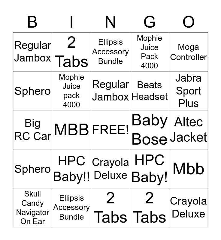This bingo card has a free space and 24 words: HPC Baby!!, Ellipsis Accessory Bundle, Regular Jambox, Skull Candy Navigator On Ear, Moga Controller, Regular Jambox, Sphero, 2 Tabs, Baby Bose, Crayola Deluxe, Beats Headset, Big RC Car, HPC Baby!, Mbb, Mophie Juice pack 4000, 2 Tabs, Altec Jacket, Ellipsis Accessory Bundle, Jabra Sport Plus, MBB, Crayola Deluxe, Sphero, Mophie Juice Pack 4000 and 2 Tabs.
