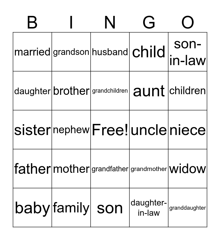 This bingo card has a free space and 24 words: mother, family, grandchildren, baby, son-in-law, married, daughter, grandson, uncle, grandfather, aunt, sister, grandmother, widow, brother, daughter-in-law, niece, husband, children, nephew, granddaughter, father, child and son.