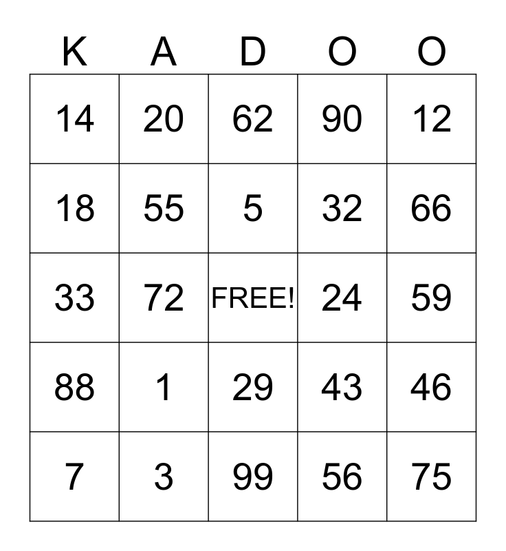 This bingo card has a free space and 24 words: 1, 3, 5, 7, 12, 14, 18, 20, 24, 29, 32, 33, 43, 46, 55, 56, 59, 62, 66, 72, 75, 88, 90 and 99.