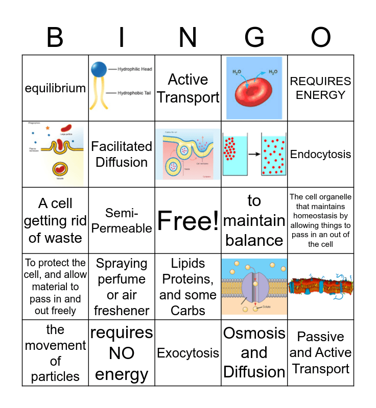 This bingo card has 9 images, a free space and 20 words: the movement of particles, Passive Transport, Semi-Permeable, the movement of WATER, equilibrium, Active Transport, Facilitated Diffusion, Spraying perfume or air freshener, to maintain balance, requires NO energy, The cell organelle that maintains homeostasis by allowing things to pass in an out of the cell, Passive and Active Transport, Exocytosis, Osmosis and Diffusion, Endocytosis, An amoeba engulfing (taking in) a food particle, Lipids Proteins, and some Carbs, To protect the cell, and allow material to pass in and out freely, REQUIRES ENERGY and A cell getting rid of waste.
