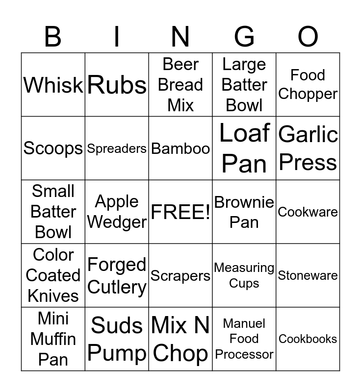 This bingo card has a free space and 24 words: Forged Cutlery, Suds Pump, Bamboo, Mini Muffin Pan, Food Chopper, Whisk, Scoops, Rubs, Brownie Pan, Scrapers, Loaf Pan, Small Batter Bowl, Measuring Cups, Stoneware, Spreaders, Manuel Food Processor, Cookware, Beer Bread Mix, Garlic Press, Apple Wedger, Cookbooks, Color Coated Knives, Large Batter Bowl and Mix N Chop.