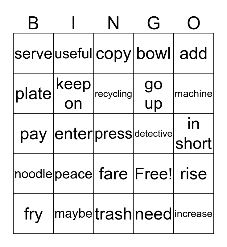 This bingo card has 25 words: peace, trash, recycling, fry, add, serve, plate, useful, detective, fare, go up, pay, Free!, rise, keep on, increase, in short, copy, machine, enter, press, maybe, noodle, bowl and need.