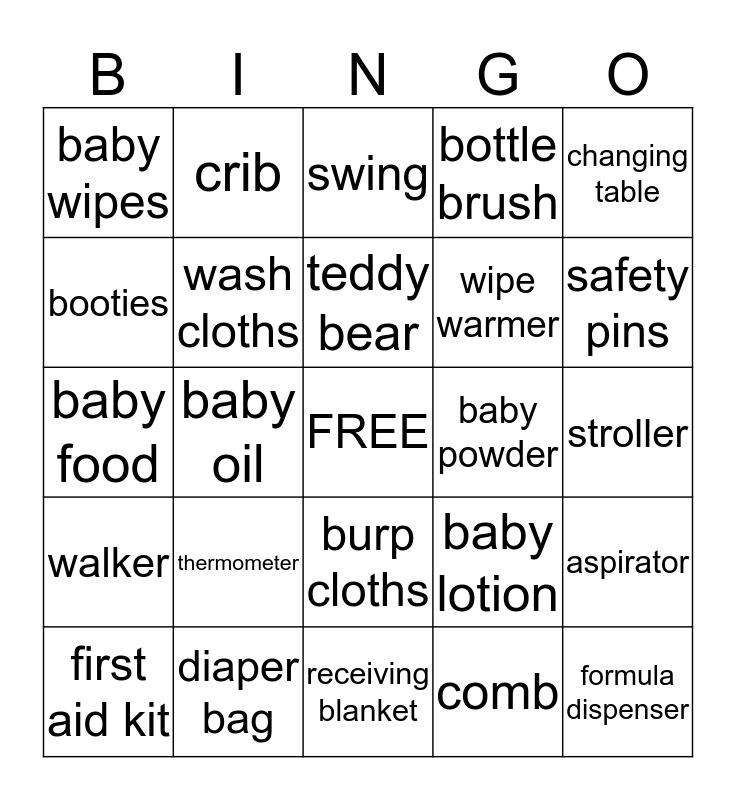 This bingo card has a free space and 24 words: thermometer, diaper bag, teddy bear, first aid kit, changing table, baby wipes, booties, crib, baby powder, burp cloths, wipe warmer, baby food, baby lotion, aspirator, wash cloths, comb, stroller, swing, safety pins, baby oil, formula dispenser, walker, bottle brush and receiving blanket.