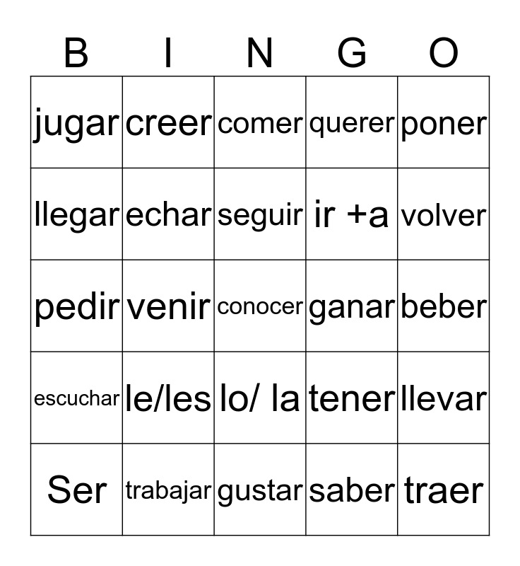 This bingo card has 29 words: Ser, estar, venir, traer, jugar, comer, echar, le/les, ganar, trabajar, beber, conocer, gustar, saber, volver, ando/iendo, lo/ la, escuchar, poner, pedir, tener, decir, ir +a, llegar, querer, creer, llevar, seguir and llamar.