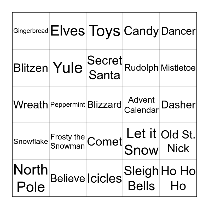 This bingo card has 64 words: Christmas, Noel, Holly Jolly, Old St. Nick, Christmas Carols, Stockings, Elves, Nutcracker, Secret Santa, Prancer, Comet, Cupid, Dasher, Dancer, Donder, Blitzen, Peppermint, Gingerbread, Silver Bells, Rudolph, Frosty the Snowman, Snowflake, Candy, Candy Cane, Chimney, Cold, Cookies, Christmas Tree, December, Fruit Cake, Wrapping Paper, Holly, Icicles, Gifts, Mistletoe, North Pole, Scrooge, Sleigh Bells, White Christmas, Yule, Wreath, Advent Calendar, Eggnog, Evergreen, Father Christmas, Blizzard, Believe, Ho Ho Ho, Let it Snow, Holiday Baking, Fireplace, Chestnuts Roasting, Icicles, Kris Kringle, Nutmeg, Cinnamon, Toys, Shopping, Ribbons, Rooftop, Sugar Plums, Vanilla, Jingle Bells and Winter Wonderland.