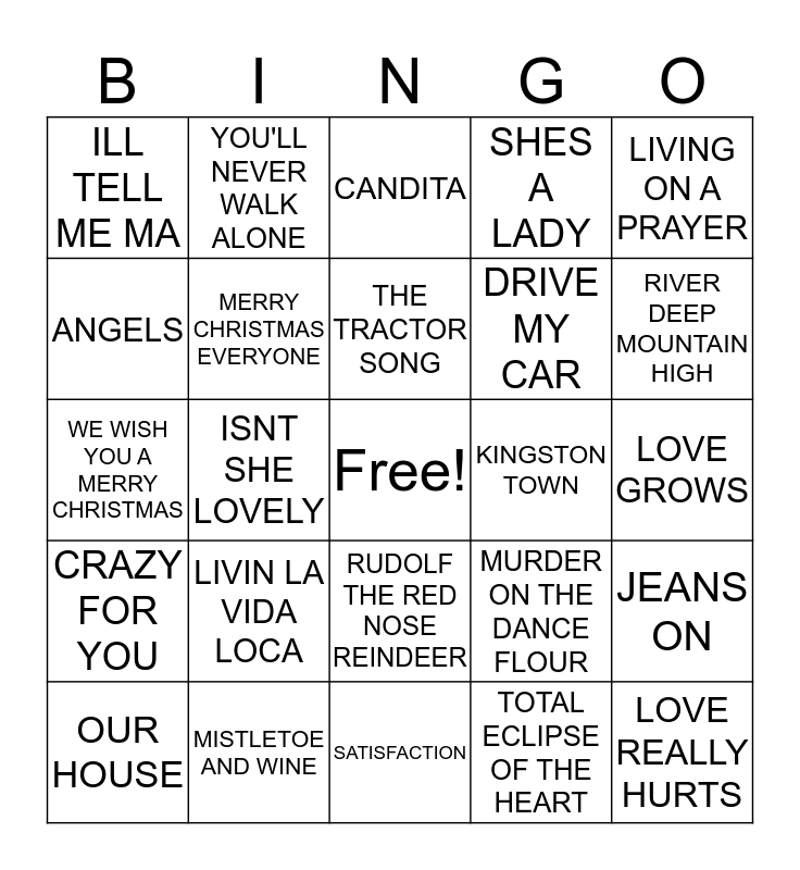 This bingo card has a free space and 40 words: I SAW MAMA KISSIN SANTA CLAUS, WE WISH YOU A MERRY CHRISTMAS, WISH IT COULD BE CHRISTMAS EVERY DAY, MERRY CHRISTMAS EVERYONE, MISTLETOE AND WINE, RUDOLF THE RED NOSE REINDEER, THE TRACTOR SONG, HELP YOUR SELF, LIVING ON A PRAYER, CRAZY FOR YOU, ISNT SHE LOVELY, SHES A LADY, LOVE REALLY HURTS, LOVE GROWS, KINGSTON TOWN, LIVIN LA VIDA LOCA, MAN I FEEL LIKE A WOMAN, ILL TELL ME MA, BLUE SUEDE SHOES, CANDITA, JEANS ON, TOTAL ECLIPSE OF THE HEART, DRIVE MY CAR, ANGELS, LADY IN RED, SWEET HOME ALABAMA, PURPLE RAIN, DAYDREAM BELIEVER, SLOW HAND, ANOTHER BRICK IN THE WALL, AFRICA, OUR HOUSE, TUTTI FRUTTI, MURDER ON THE DANCE FLOUR, RIVER DEEP MOUNTAIN HIGH, SATISFACTION, LITTLE RESPECT, LOVE FOR A REASON, YOU'LL NEVER WALK ALONE and SULTAN OF SWING.