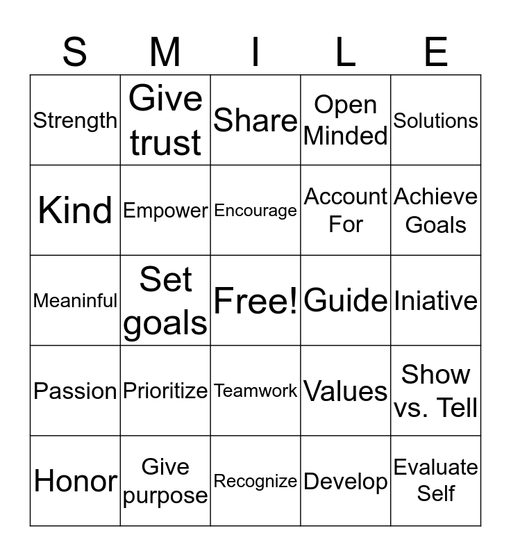 This bingo card has a free space and 34 words: Strength, Set Example, Listen, Earn Respect, Iniative, Kind, Empower, Recognize, Account For, Evaluate Self, Meaninful, Give trust, Develop, Anticipate, Passion, Set goals, Teamwork, Guide, Show vs. Tell, Honor, Give purpose, Focus, Open Minded, Achieve Goals, Thoughtful, Prioritize, Share, Believe, Solutions, Strength, Clarify, Encourage, Values and Learn.