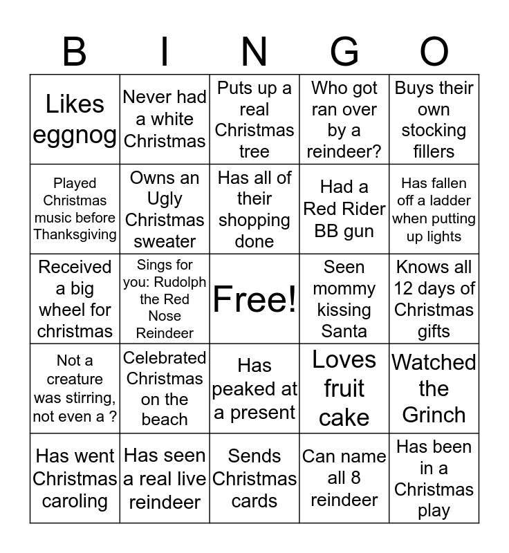 This bingo card has a free space and 24 words: Celebrated Christmas on the beach, Has seen a real live reindeer, Has all of their shopping done, Has went Christmas caroling, Buys their own stocking fillers, Likes eggnog, Played Christmas music before Thanksgiving, Never had a white Christmas, Seen mommy kissing Santa, Has peaked at a present, Had a Red Rider BB gun, Received a big wheel for christmas, Loves fruit cake, Watched the Grinch, Owns an Ugly Christmas sweater, Can name all 8 reindeer, Knows all 12 days of Christmas gifts, Puts up a real Christmas tree, Has fallen off a ladder when putting up lights, Sings for you: Rudolph the Red Nose Reindeer, Has been in a Christmas play, Not a creature was stirring, not even a ?, Who got ran over by a reindeer? and Sends Christmas cards.