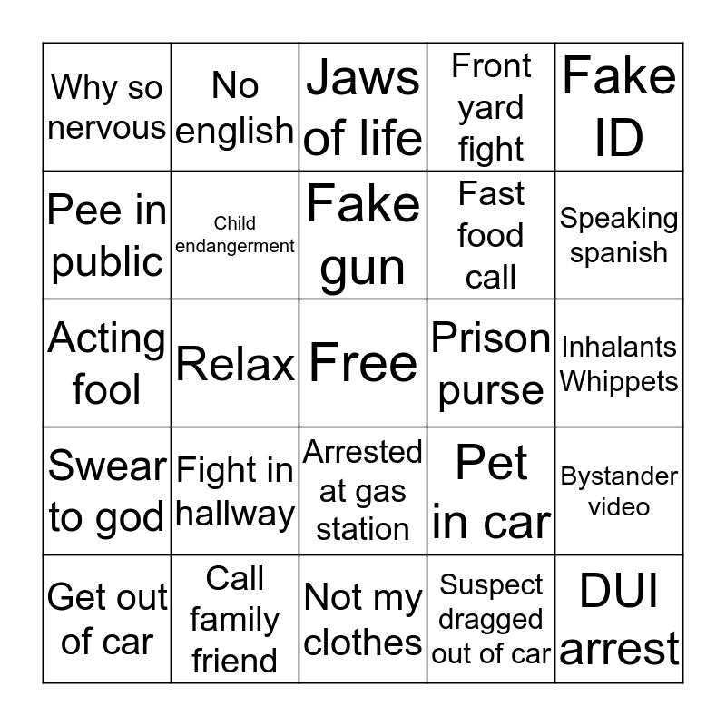 This bingo card has a free space and 24 words: Fight in hallway, Call family friend, Fake gun, Get out of car, Fake ID, Why so nervous, Pee in public, No english, Prison purse, Arrested at gas station, Fast food call, Acting fool, Pet in car, Bystander video, Child endangerment, Suspect dragged out of car, Inhalants Whippets, Jaws of life, Speaking spanish, Relax, DUI arrest, Swear to god, Front yard fight and Not my clothes.