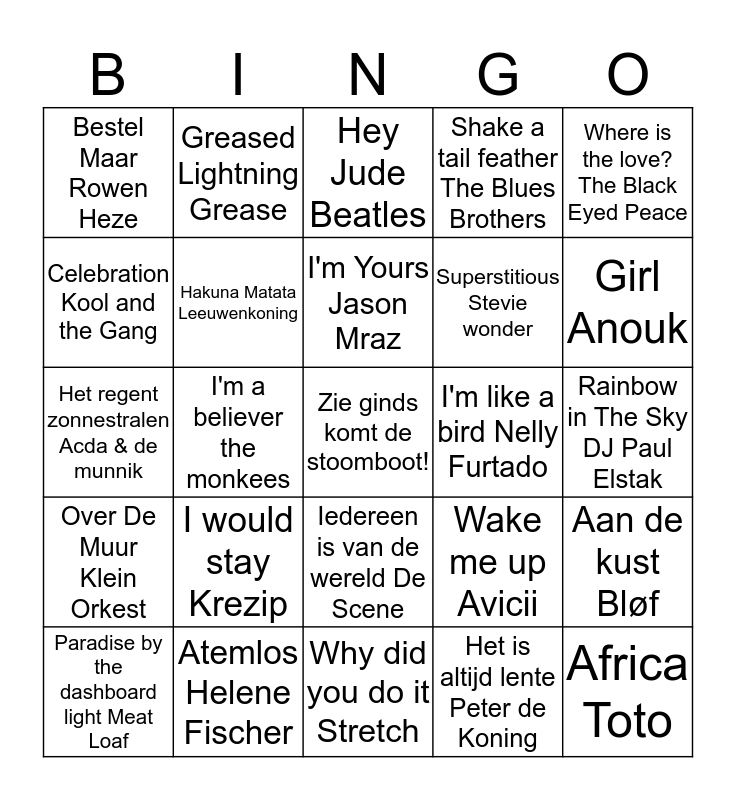 This bingo card has a free space and 74 words: Ain't no sunshine Bill Withers, Redemption song Bob Marley, I'm Yours Jason Mraz, Angel of Harlem U2, Eight days a week Beatles, Als ze er niet is De Dijk, Love me two times The Doors, Brown sugar Rollin stones, Walk of life Dire Straits, The Breeze JJ Cale, Ik kan het niet alleen De Dijk, Gimme some lovin Blues Brothers, Why did you do it Stretch, Superstitious Stevie wonder, I Wish Stevie wonder, Celebration Kool and the Gang, Disco inferno The Tramps, Iedereen is van de wereld De Scene, Satisfaction Rollin Stones, Bestel Maar Rowen Heze, I'm a believer the monkees, Hey Jude Beatles, Shake a tail feather The Blues Brothers, Girl Anouk, Het regent zonnestralen Acda & de munnik, Proosten Guus Meeuwis, Bloemetjesgordijn Wim Kersten, Bangerhart Rob de Nijs, Dromen zijn bedrog Marco Borsato, s Nachts na tweeën De havenzangers, Hakuna Matata Leeuwenkoning, Mama Mia Abba, Gimme Gimme Gimme Abba, Lemon tree Fools Garden, Brown eyed girl Van Morrison, A lalala long Bob Marley, I'm not so tough Ilse de Lange, Harder dan ik hebben kan Bløf, Aan de kust Bløf, Kom pak je lasso maar De Dikdakkers, Atemlos Helene Fischer, Verdammt Ich Lieb Dich Matthias Reim, War Kensington, Walking on the sunshine Katrina & The Waves, You're the one that I want Grease, Greased Lightning Grease, Juffrouw Toos One Two Trio, Het is altijd lente Peter de Koning, Ademnood Linda, Roos & Jessica, Laat maar waaien Peter Moeskroen, Smoorverliefd Doe Maar, Walking in Memphis Cher, I'm like a bird Nelly Furtado, Africa Toto, Viva la vida Coldplay, Summer of 69 Bryan Adams, Hotel California The Eagles, Radar Love Golden Earring, Sweet Child O'Mine Gun's n Roses, Paradise by the dashboard light Meat Loaf, I would stay Krezip, Born in the U.S.A Bruce Springsteen, Wake me up Avicii, Rainbow in The Sky DJ Paul Elstak, Over De Muur Klein Orkest, Venus Shocking Blue, 1973 James Blunt, All Summer long Kid Rock, Where is the love? The Black Eyed Peace, Wannebe Spice Girls, Dansen aan zee Bløf, Het is een nacht Guus Meeuwis, Ik leef niet meer voor jou Marco Borsato and You can't hurry love Phil Collins.