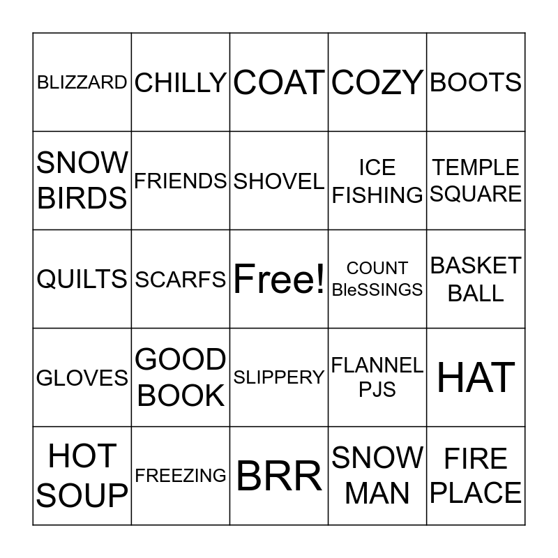 This bingo card has a free space and 35 words: GOOD BOOK, COUGH DROPS, SKIING, FRIENDS, SLIPPERY, COZY, SNOW BIRDS, ICICLE, SHOVEL, HOT COCOA, QUILTS, BOOTS, MITTENS, VITAMIN C, BLIZZARD, COUNT BleSSINGS, SNOW MAN, SCARFS, GLOVES, FIRE PLACE, FLANNEL PJS, HOT SOUP, HAT, FREEZING, COAT, TEMPLE SQUARE, ICE SKATING, FUZZY SOCKS, ICE FISHING, BASKET BALL, PRAYER, BRR, GOOD BOOK, CHILLY and SLEDDING.