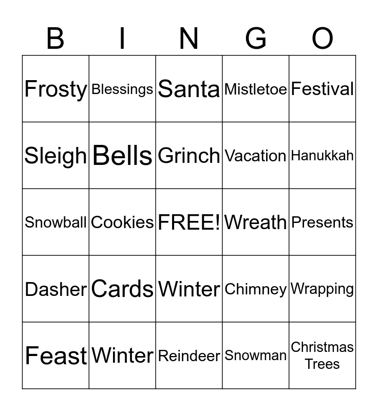 This bingo card has a free space and 24 words: Cards, Winter, Grinch, Feast, Festival, Frosty, Sleigh, Blessings, Wreath, Winter, Vacation, Snowball, Chimney, Wrapping, Bells, Snowman, Presents, Santa, Hanukkah, Cookies, Christmas Trees, Dasher, Mistletoe and Reindeer.
