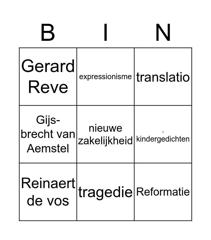 This bingo card has a free space and 14 words: humanisme, Dadaïsme, Reinaert de vos, expressionisme, Gijs-brecht van Aemstel, Reformatie, Rationalis me, Tachtigers, tragedie, Gerard Reve, Age of reason, . kindergedichten, translatio and De kleine Johannes.