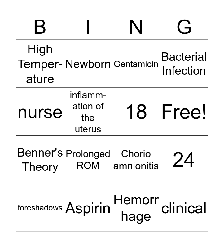 This bingo card has 18 words: Prolonged ROM, clinical, Gentamicin, High Temper- ature, Chorio amnionitis, Bacterial Infection, foreshadows, Newborn, Free!, Benner's Theory, Hemorr hage, nurse, 24, inflamm- ation of the uterus, 18, Vaginal Exams, Aspirin and contraction.