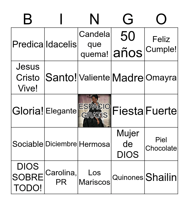 This bingo card has a free space and 24 words: Diciembre, Carolina, PR, Valiente, DIOS SOBRE TODO!, Feliz Cumple!, Predica, Jesus Cristo Vive!, Idacelis, Fiesta, Hermosa, Madre, Gloria!, Mujer de DIOS, Piel Chocolate, Santo!, Quinones, Fuerte, Candela que quema!, Omayra, Elegante, Shailin, Sociable, 50 años and Los Mariscos.