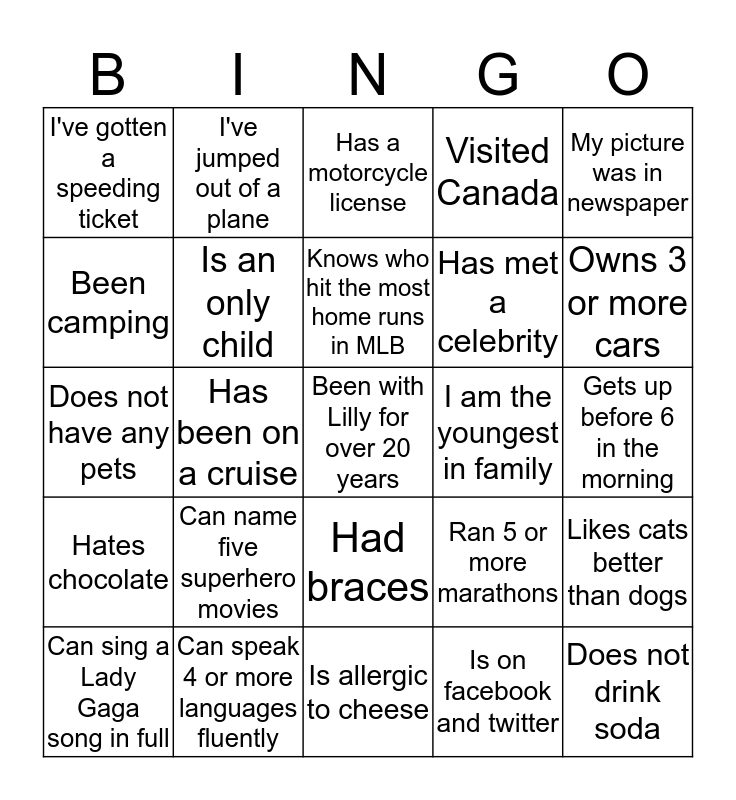 This bingo card has a free space and 24 words: Can name five superhero movies, Can speak 4 or more languages fluently, Knows who hit the most home runs in MLB, Can sing a Lady Gaga song in full, My picture was in newspaper, I've gotten a speeding ticket, Been camping, I've jumped out of a plane, I am the youngest in family, Had braces, Has met a celebrity, Does not have any pets, Ran 5 or more marathons, Likes cats better than dogs, Is an only child, Is on facebook and twitter, Gets up before 6 in the morning, Has a motorcycle license, Owns 3 or more cars, Has been on a cruise, Does not drink soda, Hates chocolate, Visited Canada and Is allergic to cheese.