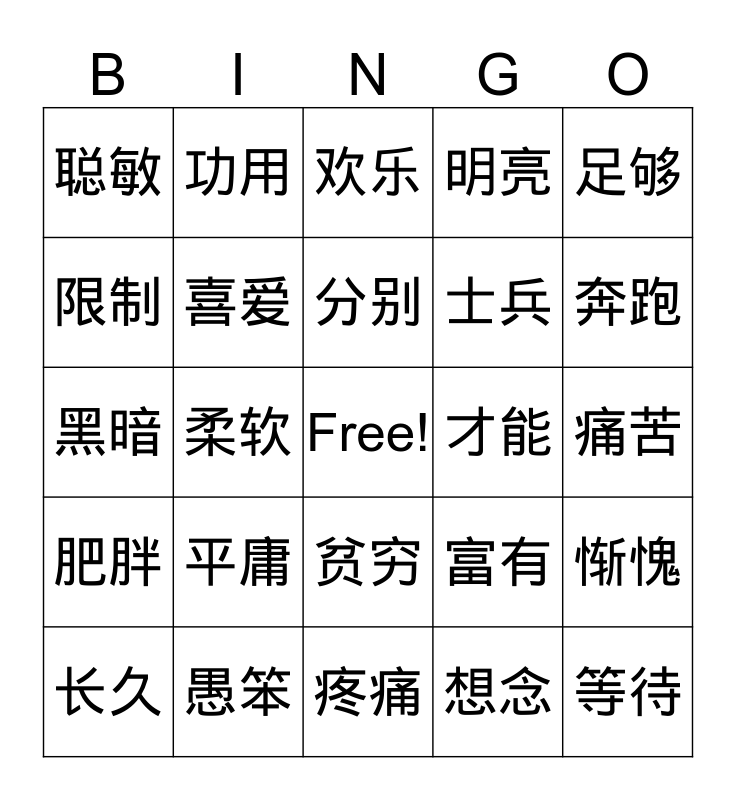 This bingo card has a free space and 24 words: 平庸, 愚笨, 分别, 长久, 足够, 聪敏, 限制, 功用, 才能, 贫穷, 士兵, 黑暗, 富有, 惭愧, 喜爱, 想念, 痛苦, 欢乐, 奔跑, 柔软, 等待, 肥胖, 明亮 and 疼痛.