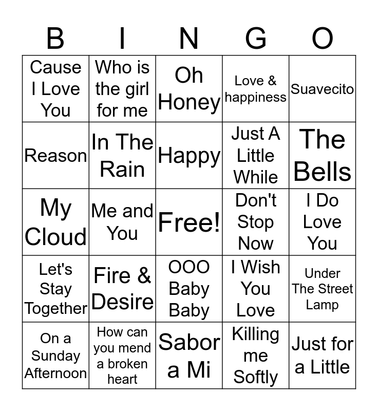 This bingo card has a free space and 25 words: Fire & Desire, Sabor a Mi, Happy, On a Sunday Afternoon, Suavecito, Cause I Love You, Reason, Who is the girl for me, Don't Stop Now, OOO Baby Baby, Just A Little While, My Cloud, I Wish You Love, Under The Street Lamp, In The Rain, Make It With You, I Do Love You, Oh Honey, The Bells, Me and You, Just for a Little, How can you mend a broken heart, Let's Stay Together, Love & happiness and Killing me Softly.