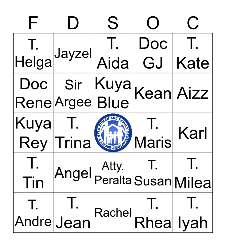 This bingo card has a free space and 35 words: Sir Greg, Sir Paeng, Sir Neph, Sir Argee, Atty. Peralta, Doc GJ, Doc Rene, Kuya Allan, Kuya Blue, Kuya Daph, Kuya Rey, T. Kate, T. Mile, T. Sai, T. Helga, T. Maris, T. Rhea, T. Trina, T. Tin, T. Iyah, T. Susan, T. Andre, T. Milea, T. Jean, T. Aida, Aizz, Wynona, Ina, Kean, Karl, Joanne, Rachel, Angel, Jayzel and Mary.