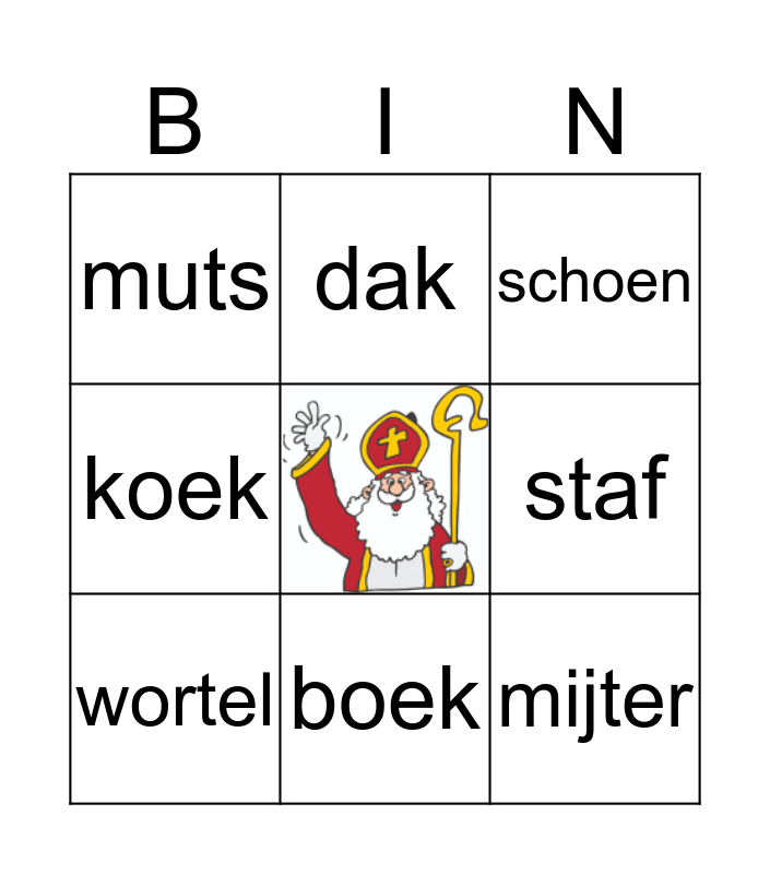 This bingo card has a free space and 17 words: paard, letter, schoen, muts, ring, koek, pak, wortel, boek, staf, boot, sint, mijter, dak, haard, zak and maan.