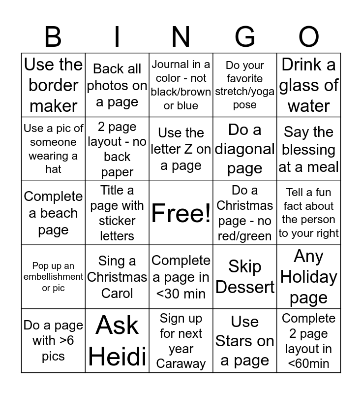 This bingo card has a free space and 24 words: Sing a Christmas Carol, Ask Heidi, Use the letter Z on a page, Do a page with >6 pics, Drink a glass of water, Use the border maker, Use a pic of someone wearing a hat, Back all photos on a page, Do a Christmas page - no red/green, Complete a page in <30 min, Do a diagonal page, Complete a beach page, Skip Dessert, Any Holiday page, 2 page layout - no back paper, Use Stars on a page, Tell a fun fact about the person to your right, Journal in a color - not black/brown or blue, Say the blessing at a meal, Title a page with sticker letters, Complete 2 page layout in <60min, Pop up an embellishment or pic, Do your favorite stretch/yoga pose and Sign up for next year Caraway.
