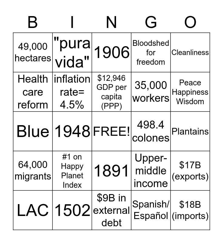 This bingo card has a free space and 24 words: #1 on Happy Planet Index, 1502, $12,946 GDP per capita (PPP), LAC, Cleanliness, 49,000 hectares, Health care reform, "pura vida", 498.4 colones, 1891, 35,000 workers, Blue, Upper-middle income, $17B (exports), inflation rate= 4.5%, Spanish/ Español, Plantains, 1906, Peace Happiness Wisdom, 1948, $18B (imports), 64,000 migrants, Bloodshed for freedom and $9B in external debt.