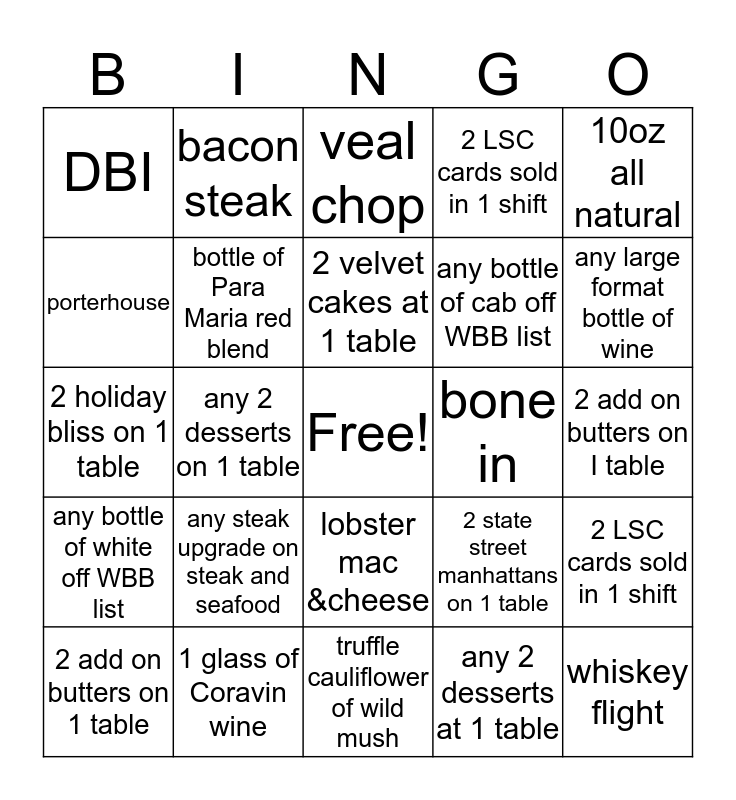 This bingo card has a free space and 24 words: any steak upgrade on steak and seafood, 1 glass of Coravin wine, 2 velvet cakes at 1 table, 2 add on butters on 1 table, 10oz all natural, DBI, porterhouse, bacon steak, bone in, lobster mac &cheese, any bottle of cab off WBB list, 2 holiday bliss on 1 table, 2 state street manhattans on 1 table, 2 LSC cards sold in 1 shift, bottle of Para Maria red blend, any 2 desserts at 1 table, 2 add on butters on I table, veal chop, any large format bottle of wine, any 2 desserts on 1 table, whiskey flight, any bottle of white off WBB list, 2 LSC cards sold in 1 shift and truffle cauliflower of wild mush.