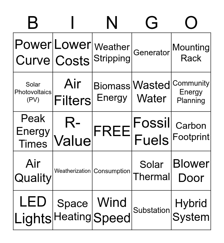This bingo card has a free space and 24 words: Weatherization, Space Heating, Biomass Energy, LED Lights, Mounting Rack, Power Curve, Solar Photovoltaics (PV), Lower Costs, Fossil Fuels, Consumption, Wasted Water, Peak Energy Times, Solar Thermal, Blower Door, Air Filters, Substation, Carbon Footprint, Weather Stripping, Community Energy Planning, R-Value, Hybrid System, Air Quality, Generator and Wind Speed.