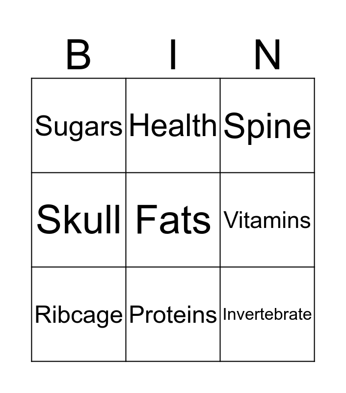 This bingo card has 24 words: Free!, Carbohydrates, Proteins, Dairy, Fats, Sugars, Vitamins, Health, Energy, Vertebrate, Invertebrate, Bone, Skeleton, Skull, Ribcage, Pelvis, Femur, Spine, Pelvis, Rib Cage, Heart, Lungs, Skull and Thorax.