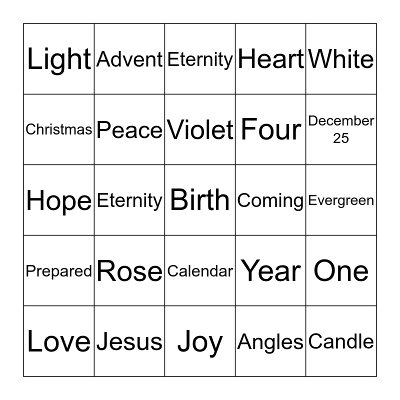 This bingo card has 25 words: Rose, Joy, Violet, Love, White, Light, Christmas, Advent, Coming, Calendar, Four, Hope, Year, One, Peace, Candle, Evergreen, Eternity, December 25, Eternity, Birth, Jesus, Prepared, Heart and Angles.